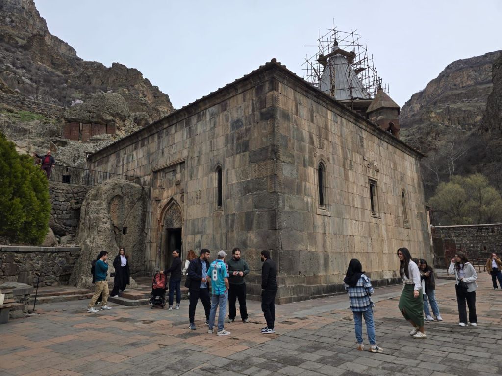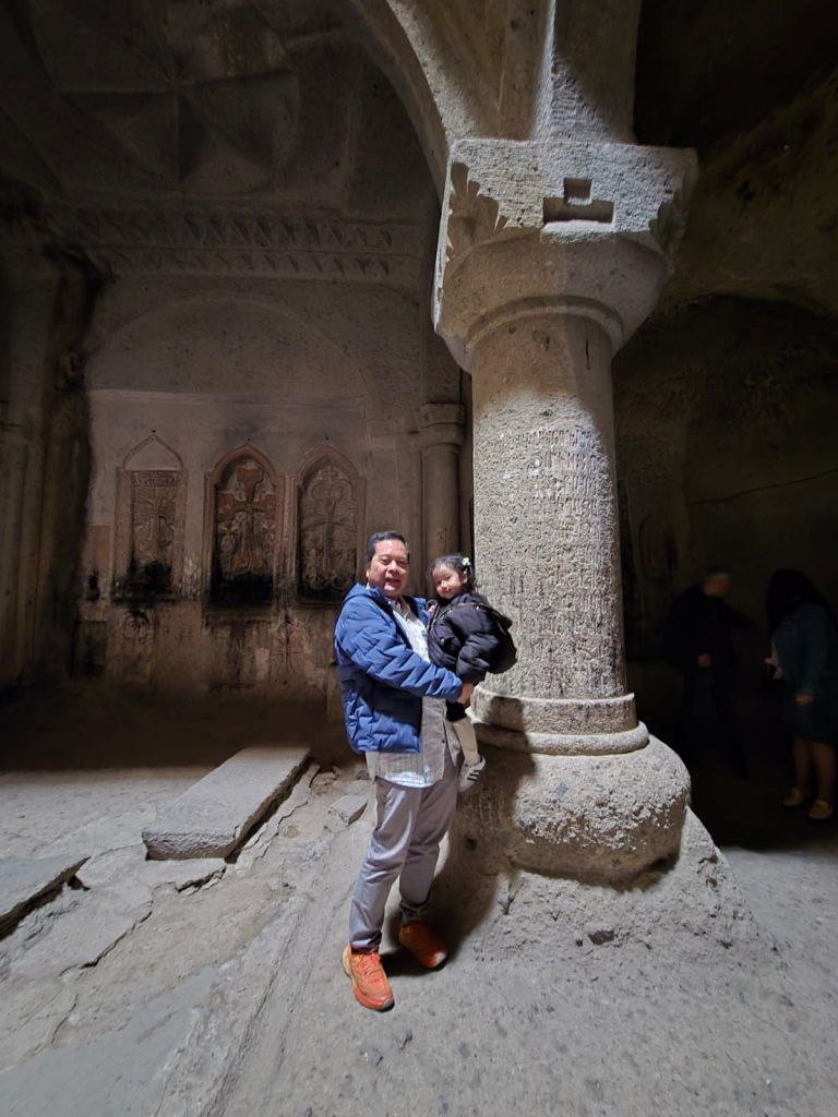 Sabtu, 5 April 2025, kami memulai hari dengan sarapan di hotel. Sekitar jam 9.30, Gega menjemput kami di hotel, kali ini dia membawa seorang teman, local guide dari Yerevan yang akan menemani kami berwisata. Tujuan pertama pagi ini, kami meluncur ke arah timur Yerevan untuk mengunjungi Biara Geghard (Geghard Monastery), salah satu gereja paling terkenal di Armenia. Kompleks gereja ini unik, sebagian bangunannya dipahat langsung ke dinding gunung, menciptakan kombinasi luar biasa antara arsitektur dan alam.
