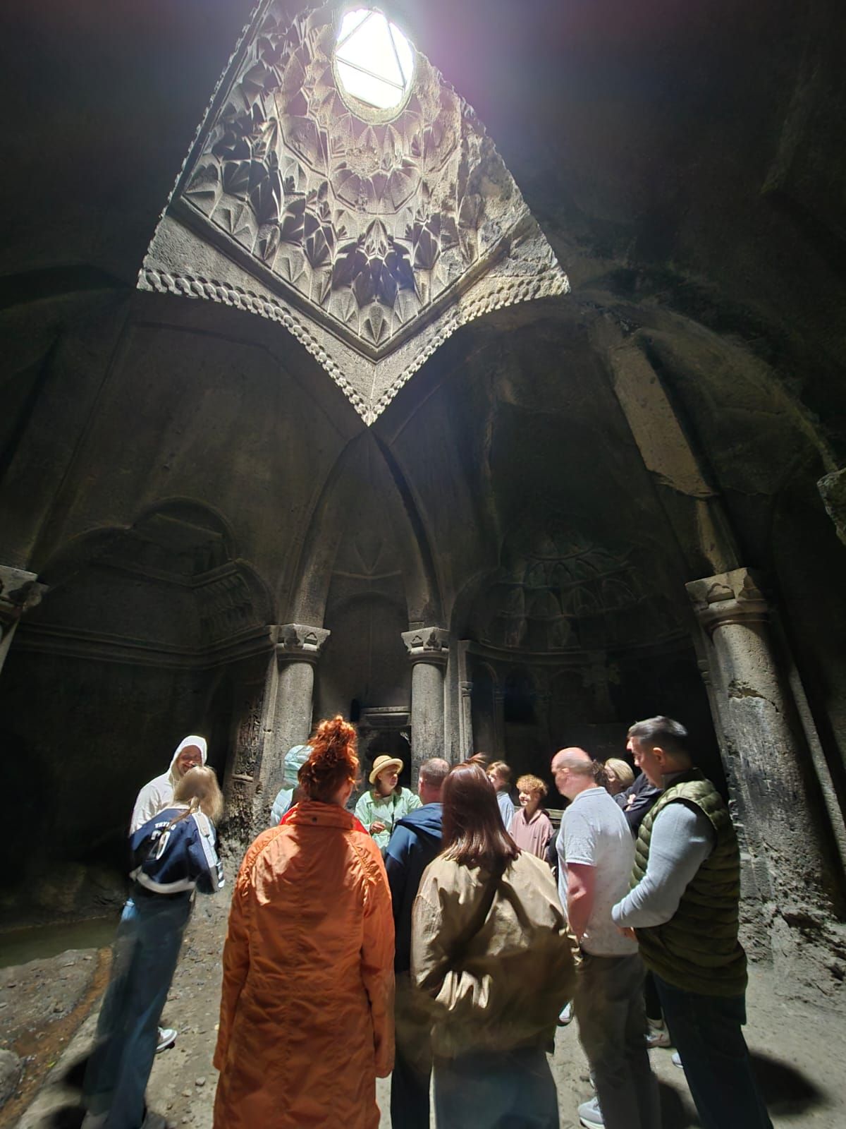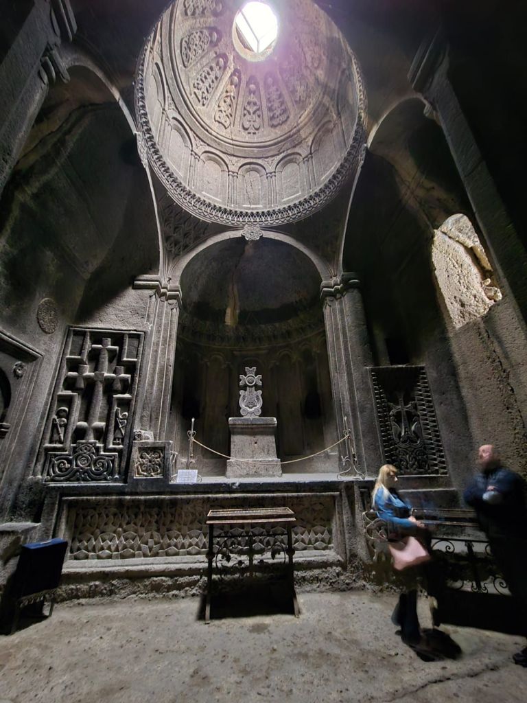 Suasana di dalam sangat tenang, bahkan terasa mistis, dengan gema doa yang terdengar lembut. Ada dua ruang gereja di Geghard monastery ini, bangunan utama di lantai bawah dengan aula yang besar, satu lagi ruangan chapel di bagian atas batu gunung. Kedua ruangan ini terhubung dengan lubang kecil, sehingga jika kita berada di ruangan atas, kita bisa melihat aktivitas dan mendengar suara dari aula utama gereja. Kompleks Geghard ini juga termasuk dalam situs warisan budaya dunia UNESCO.