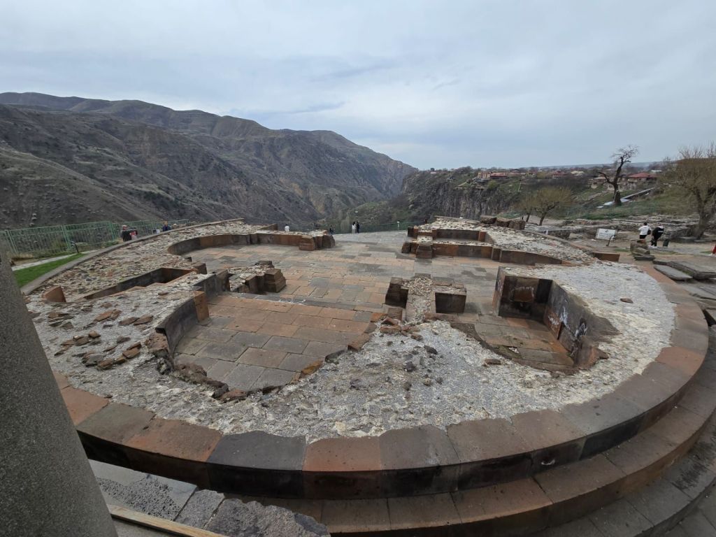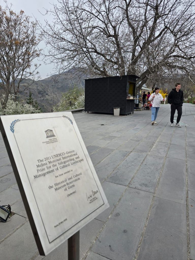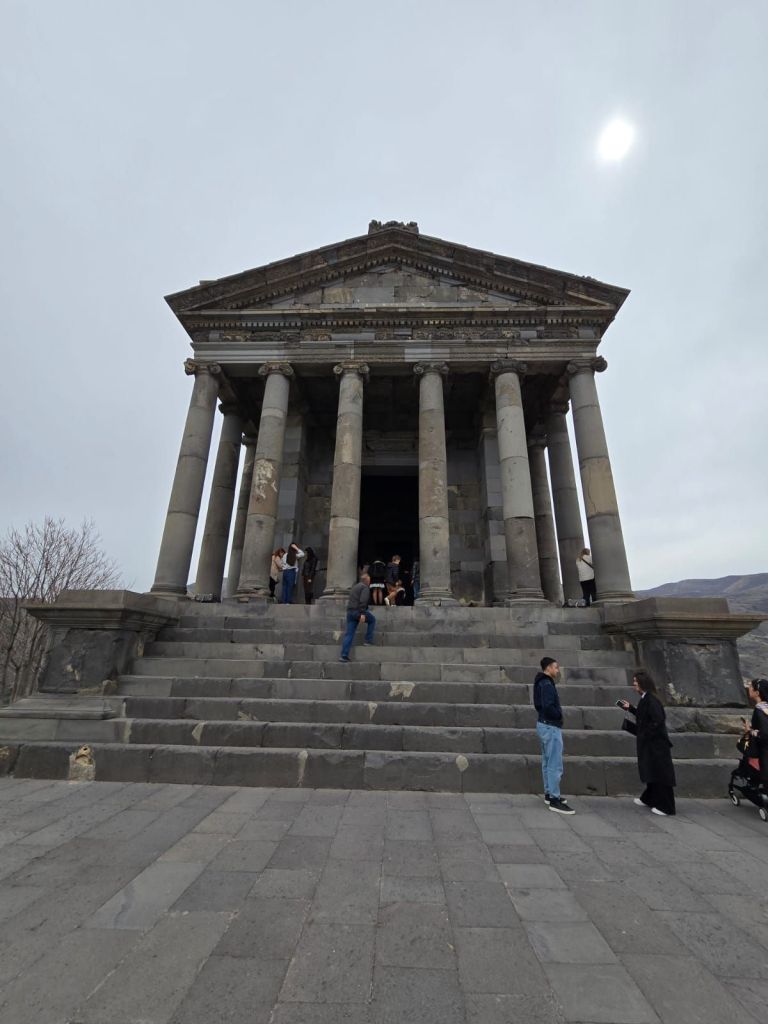 Kami lanjut ke Garni Historical and Cultural Museum, lokasi Kuil Garni, satu-satunya kuil bergaya Yunani-Romawi di kawasan Caucasus. Berdiri megah di tepi tebing, kuil ini menjadi simbol warisan pra-Kristen Armenia. Diperkirakan, kuil ini dibangun sekitar 100 tahun sebelum masehi, sebagai kuil pemujaan kepada dewa matahari, Mihr. Pada abad 17, kuil ini runtuh akibat gempa bumi. Kuil ini lama dibiarkan runtuh, dan baru digali kembali pada abad 20. Restorasi penuh berlangsung antara tahun 1969-1976 oleh pemerintahan Uni Sovyet. Sejak kuil ini selesai direstorasi, sebagian penganut neo-paganism di Armenia menjadikan kuil ini sebagai kuil utama mereka. Di sekitar kuil ini juga terdapat reruntuhan pemandian Romawi dan reruntuhan gereja yang terletak persis di sebelah kuil Garni. Gereja ini turut hancur akibat gempa pada abad ke 17, menyisakan pondasi dan bagian tembok setinggi 1 meter, hingga saat ini gereja ini tidak direstorasi. Di beberapa bagian dari kuil ini, kita bisa melihan pahatan aksara arab, yang menandakan wilayah ini pernah dikuasai kerajaan Persia, salah satu teori sejarah menyebutkan kuil ini pernah dikonversi menjadi masjid pada abad 10-11.