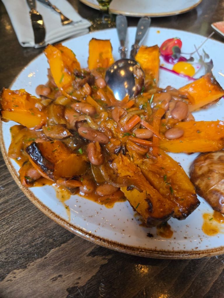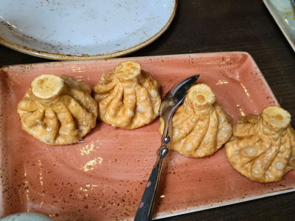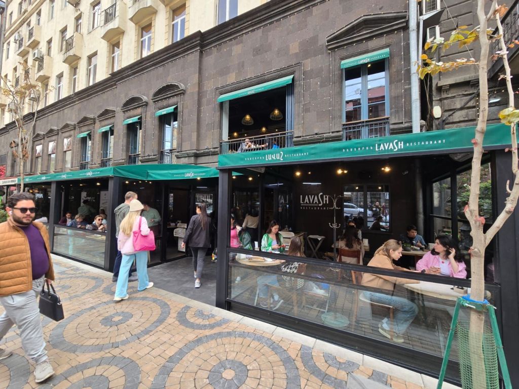 Siang harinya kami kembali ke pusat kota dan makan siang di Shererep Restaurant. Guide kami merekomendasikan beberapa makanan khas Armenia, antara lain Ghapama Lavash, daging sapi dan kacang merah yang dimasak dalam buah labu. Saat memesan menu ini kami diinformasikan bahwa memasaknya lama, perlu sekitar 45 menit, namun karena penasaran, kami tetap memesan menu tersebut. Rasanya, aduhai lezatnya, bagi saya, ini adalah makanan paling enak selama perjalanan kami di Caucasus ini. Kami juga memesan fried khinkali Armenia, yang sedikit berbeda dengan steamed khinkali yang banyak tersedia di Georgia.