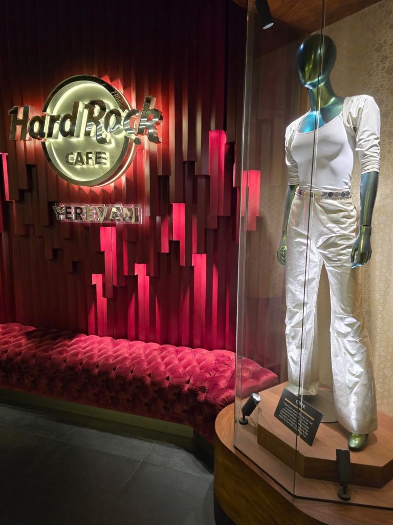 Kami juga mampir ke Hard Rock Cafe Yerevan, satu-satunya Hard Rock Cafe yang masih tersisa di wilayah Caucasus. Sebelumnya pernah ada Hard Rock Cafe di Baku dan Tbilisi, namun keduanya telah tutup sejak beberapa tahun lalu. Hard Rock Cafe Yerevan juga menjadi salah satu testamen atas kontrbusi bangsa Armenia untuk musik rock dunia. Beberapa penyanyi dan band rock terkenal, merupakan keturunan Armenia, seperti Cher, band System of A Down dan juga keluarga Kardashian. Beberapa memorabilia yang dipajang di Hard Rock Cafe Yerevan ini merupakan sumbangan dari Cher dan juga Serj Tankian, vokalis dari band System of A Down.