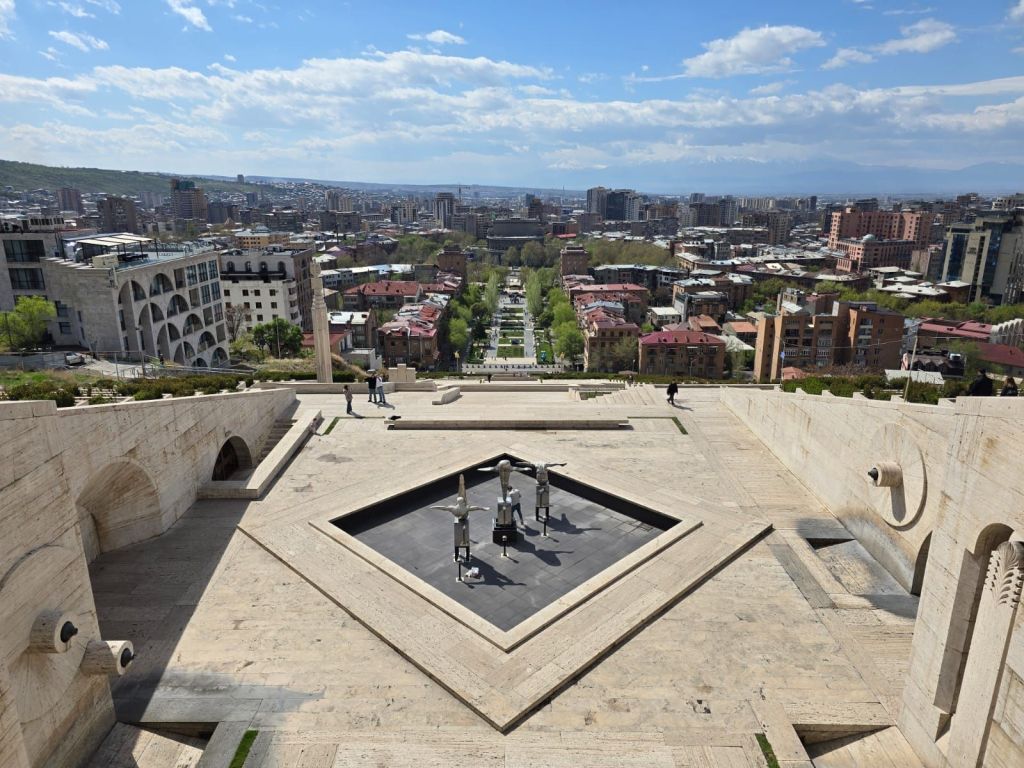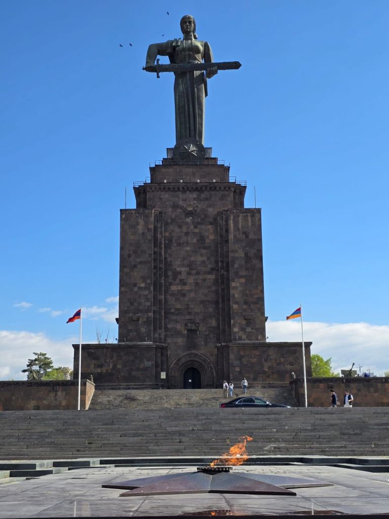 Hari terakhirdi Caucasus, Minggu 6 April 2025, kami isi dengan tur kota Yerevan yang lebih santai namun tetap menarik. Kami mengunjungi patung Mother of Armenia, simbol kekuatan dan perlindungan negara. Di kompleks ini juga dipajang berbagai peralatan militer Armenia, mulai dari pesawat tempur, tank, canon dan truk miiter. Dari sini, kami bisa melihat panorama kota yang dikelilingi pegunungan, termasuk Gunung Ararat yang terkenal, meski letaknya kini di wilayah Turki, gunung ini tetap sangat bermakna bagi rakyat Armenia. Di teras depan patung mother of Armenia ini terdapat api abadi, yang merupakan simbol kekuatan dan semangat bangsa Armenia yang tak pernah padam.