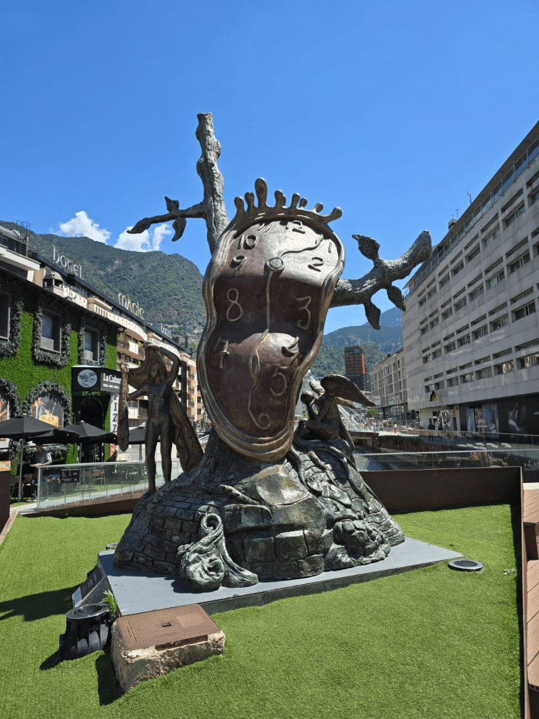 Setelah puas menjelajah kawasan Old Town, saya menuju tepian sungai La Valira. Sungai ini membelah kota, dengan jembatan-jembatan ikonik yang sering jadi spot foto turis. Salah satunya Puente de París, jembatan modern dengan desain baja berbentuk kipas yang mencolok. Dekat situ, ada patung karya Salvador Dalí berjudul La Noblesse du Temps, sebuah patung seni berbentuk jam meleleh khas gaya surreal Dalí, seakan mengingatkan bahwa waktu di kota kecil ini memang berjalan lebih lambat.